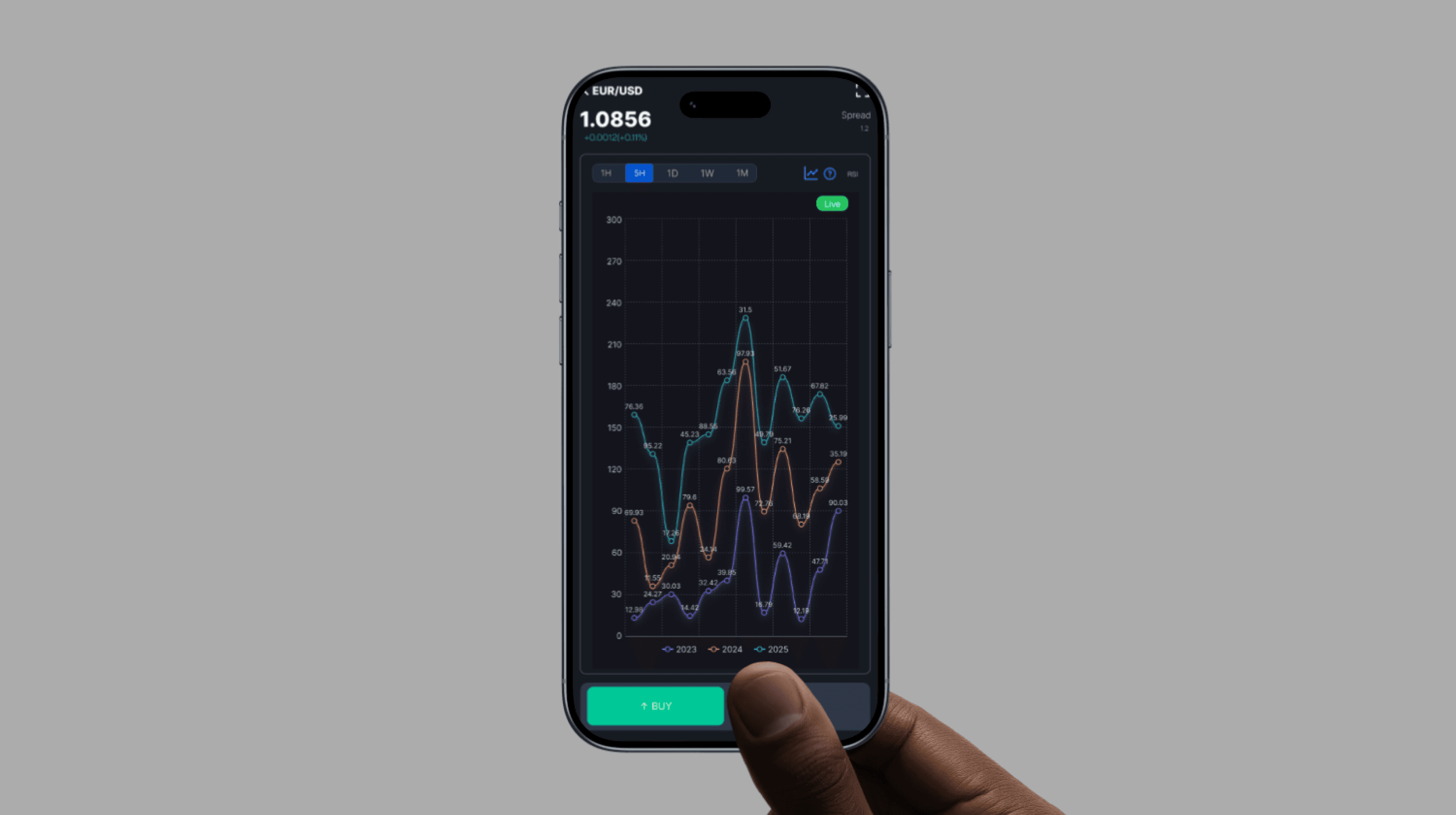 Detailed Asset View: Tapping on an asset brings the user to a detailed screen with a large, interactive chart. The ability to switch between timeframes (1H, 5H, 1D, etc.) and view indicators like RSI is standard but well-executed. This screen is uncluttered, focusing the user's attention on analysis before making a trade.