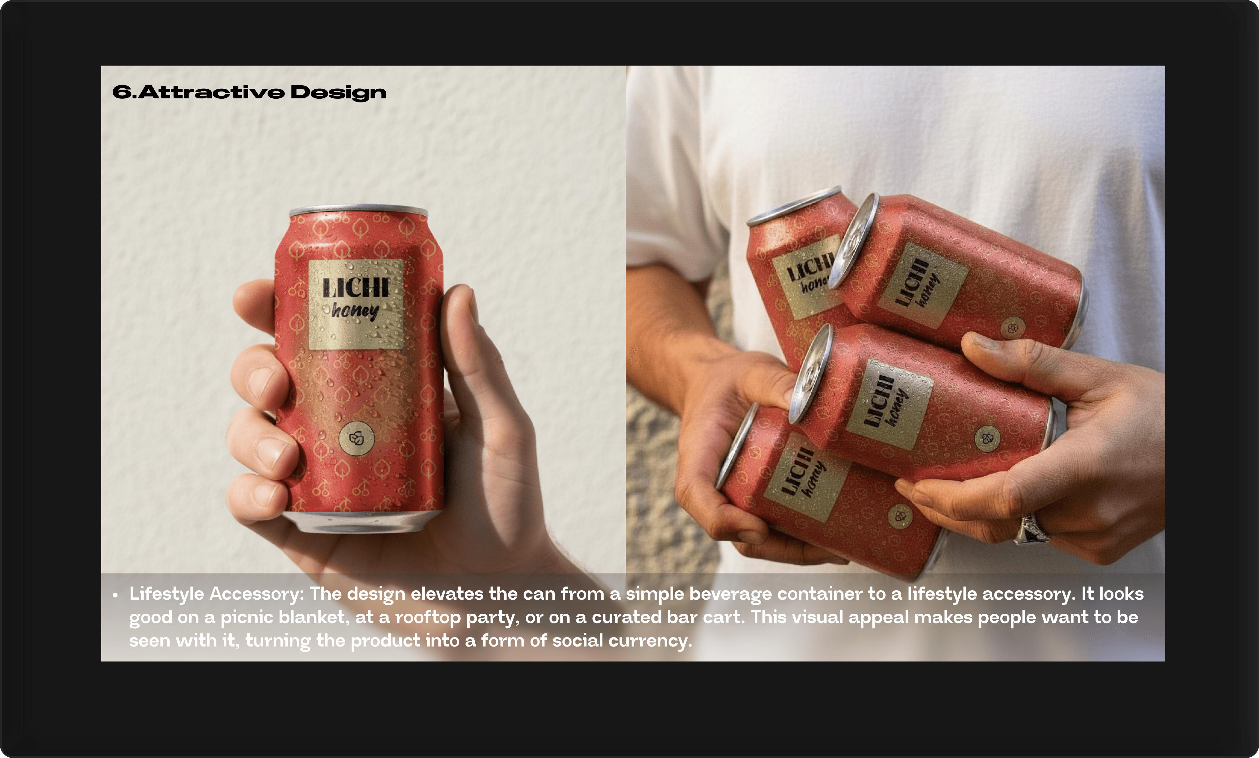 High "Shareability": The vibrant, colorful cans are inherently photogenic. The distinct patterns and aesthetic appeal make them highly "Instagrammable," turning the product itself into a shareable social object and a vehicle for organic marketing.