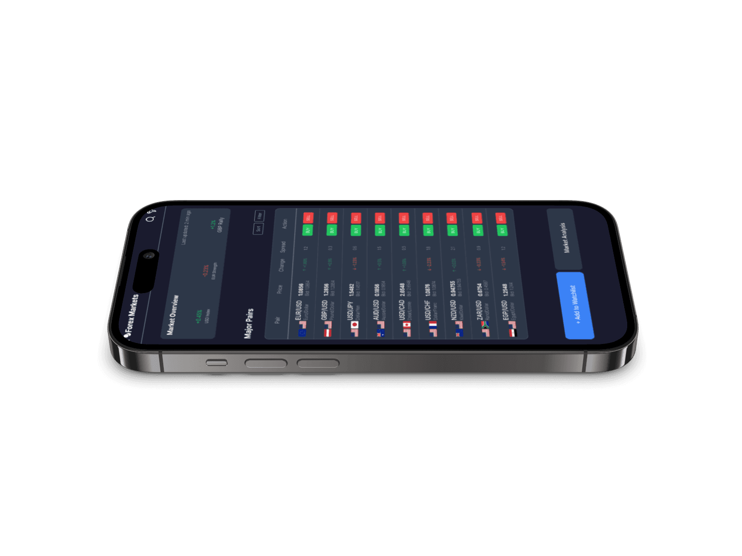 Watchlist & Market Lists: The app provides clear, scannable lists for different asset classes (Forex, Crypto). Each list item efficiently displays the asset name, symbol, price, and percentage change. The prominent "Buy" and "Sell" buttons on the Forex list allow for quick action.